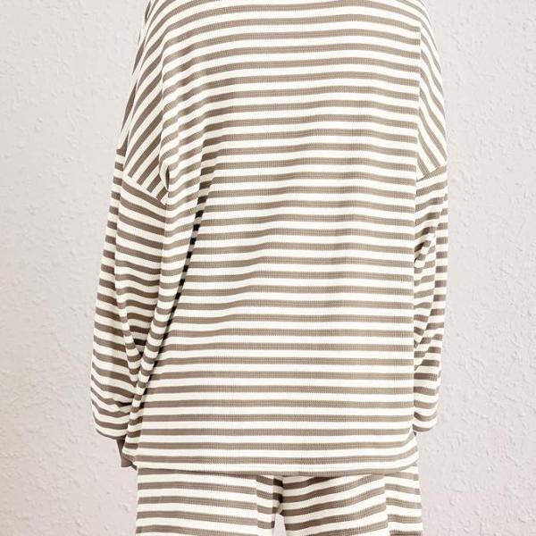 Fayenne Womens Striped 2 Piece Outfits with Pockets Casual Long Sleeve Waffle Knit Textured Tops & High Waisted Shorts