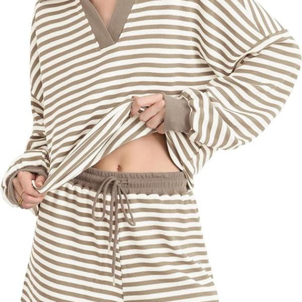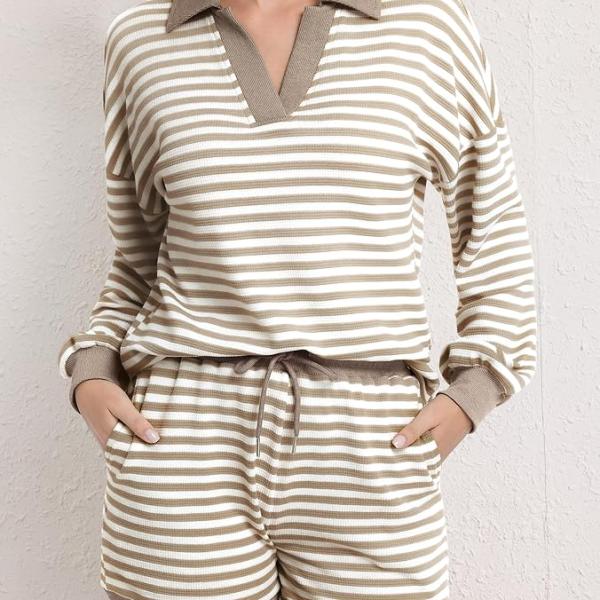 Stylish Design: This women's oversized sweater set features a chic long sleeve design with a flattering V neckline and collar/lapel neck. The high drawstring elastic waist shorts with pockets offer a loose fit, complemented by playful colorful stripes that elevate your casual look.
