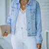 The women's denim jackets features collared neckline design, button down closure, two flap chest pockets and side pockets, single-breasted, long sleeve fashion jacket, distressed denim jacket.