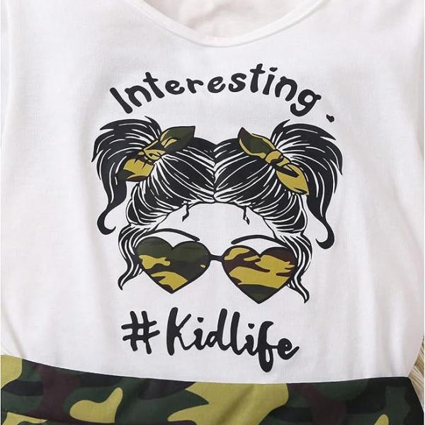 Features: 2 piece outfits for girls, with letter graphic print tee and camo print aline skirt set