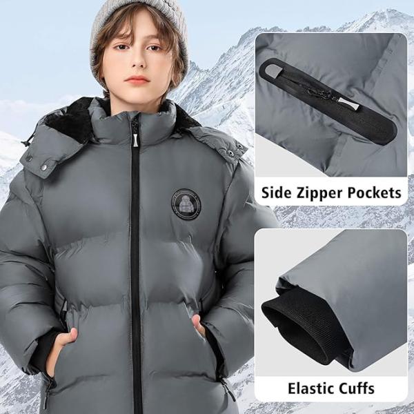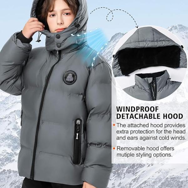 Comfort Design: Featuring a detachable hood with fleece lining and elastic cuffs, the kids' winter coat provides a snug fit while blocking cold drafts for all-day comfort.