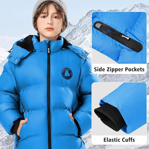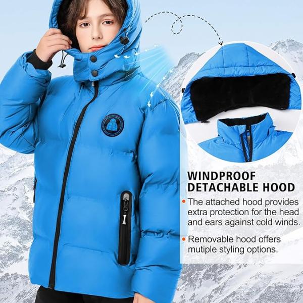 • Comfort Design: Featuring a detachable hood with fleece lining and elastic cuffs, the kids' winter coat provides a snug fit while blocking cold drafts for all-day comfort.